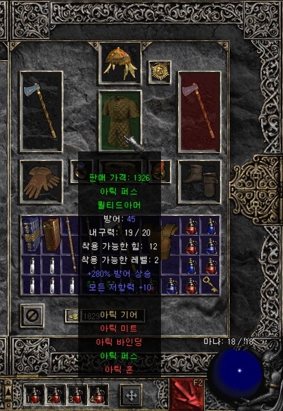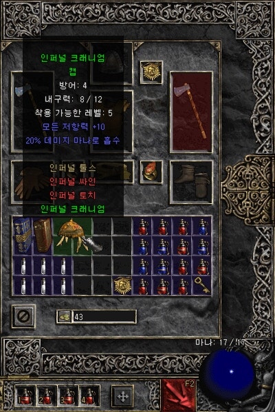 룬워드 작업을 할 수 없는 오리지널이기 때문에 드랍하는 레어, 매직, 유니크 템이나 상점표 매직템을 잘 활용해야 할 것 같은 나이트메어 입니다.